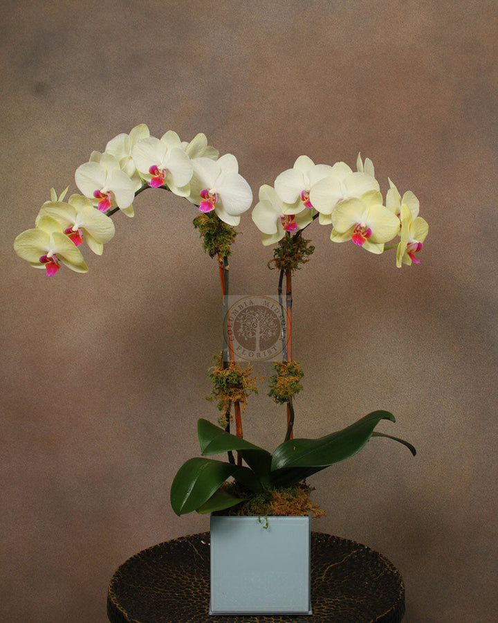 This is a yellow with red lips double stem orchid in a modern plate glass cube. We try and pick orchids with many flowers so as they bloom out you get a spectacular 4-8 week show.
